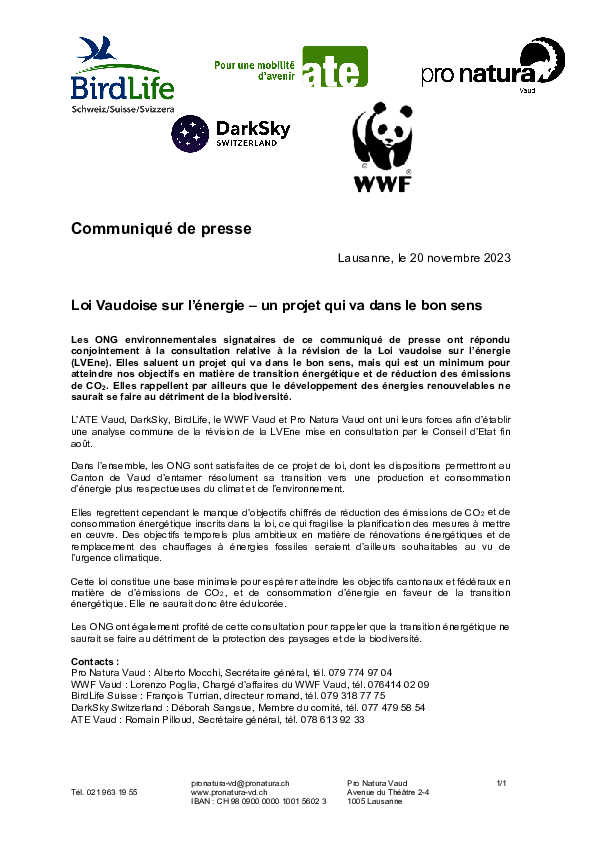 L’ATE Vaud, DarkSky, BirdLife, le WWF Vaud et Pro Natura Vaud ont uni leurs forces afin d’établir une analyse commune de la révision de la LVEne mise en consultation par le Conseil d’Etat fin août.