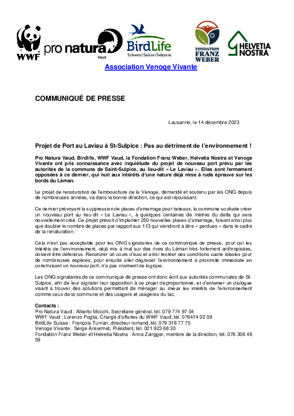 Pro Natura Vaud, Birdlife, WWF Vaud, la Fondation Franz Weber, Helvetia Nostra et Venoge Vivante ont pris connaissance avec inquiétude du projet de nouveau port prévu par les autorités de la commune de Saint-Sulpice, au lieu-dit « Le Laviau ». Elles sont fermement opposées à ce dernier, qui nuit aux intérêts d’une nature déjà mise à rude épreuve sur les bords du Léman.